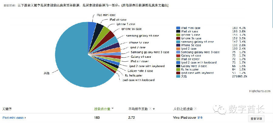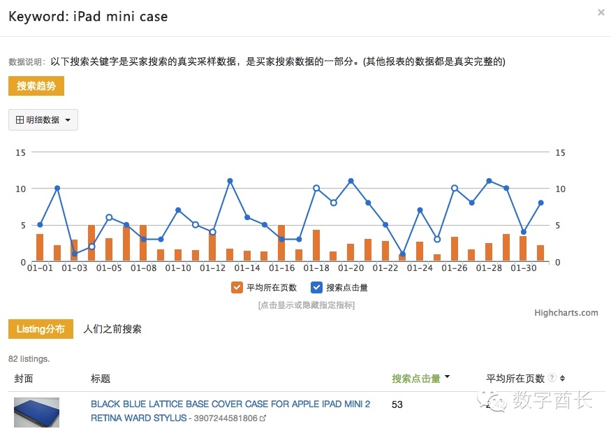 数字酋长搜集到的关键字是真实用户通过在eBay搜索进入Listing后获得的真实采样数据,可以了解用户真正是通过哪些关键字,进入到了具体的listing页面。饼图的中的其他,代表更多的长尾词,在拉下来的详细列表中可以查看到。